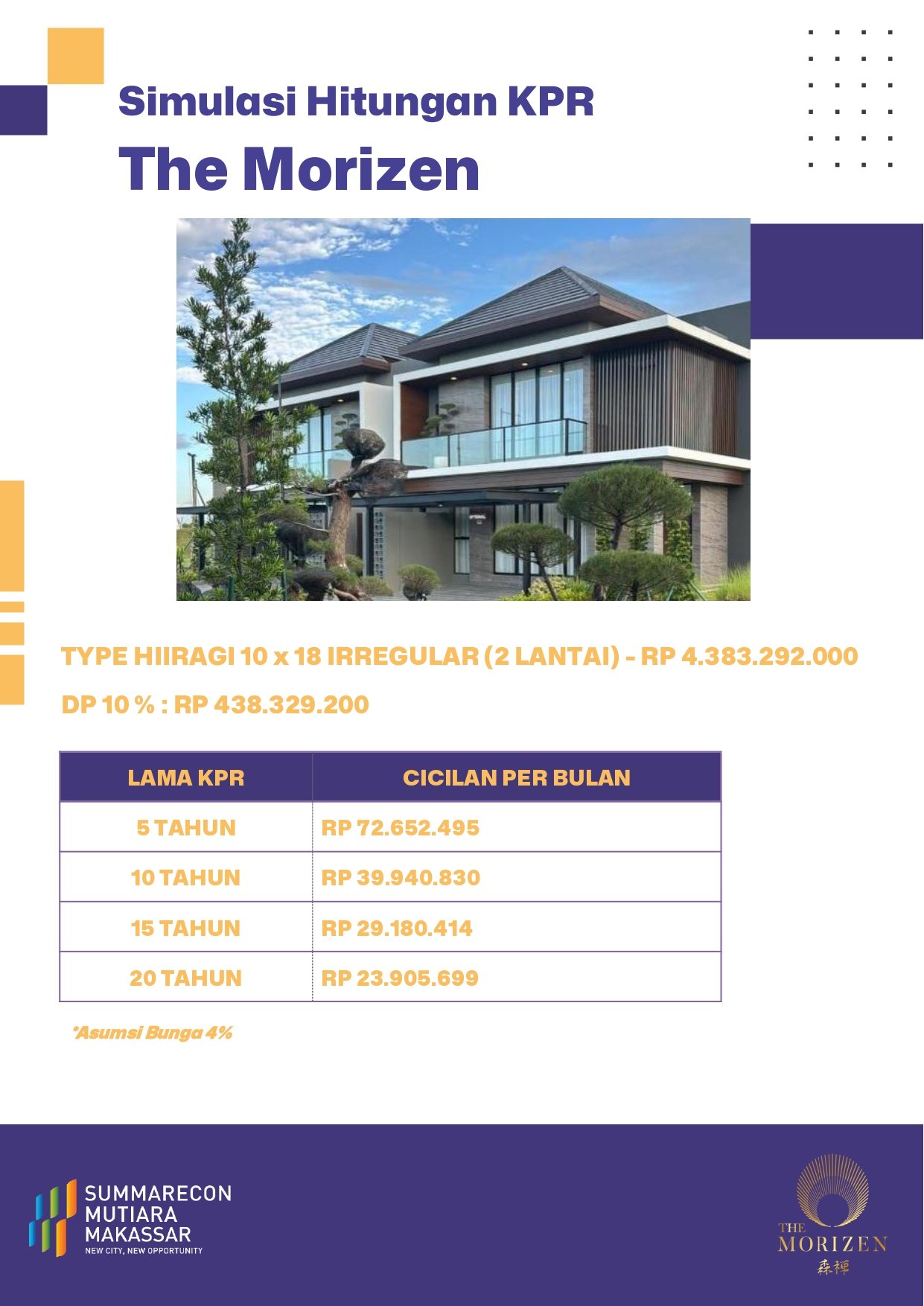Untuk memudahkan kepemilikan, tersedia simulasi Kredit Pemilikan Rumah (KPR) dengan asumsi bunga 4%: